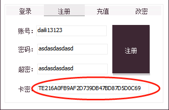 一样账号密码随便设置,超密也就是重复确认一遍密码,卡密就是我们购买的卡密粘贴上去就行,如图: